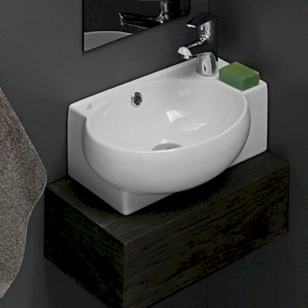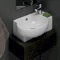 Corner bathroom sink made of white ceramic. This sleek, space saving bathroom sink includes 1 faucet hole and an overflow. Sink can either be mounted to the wall or a place above a counter (vessel application). Sink is designed by high-end and well known Turkish brand CeraStyle.
