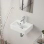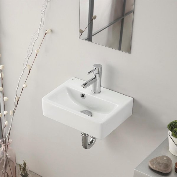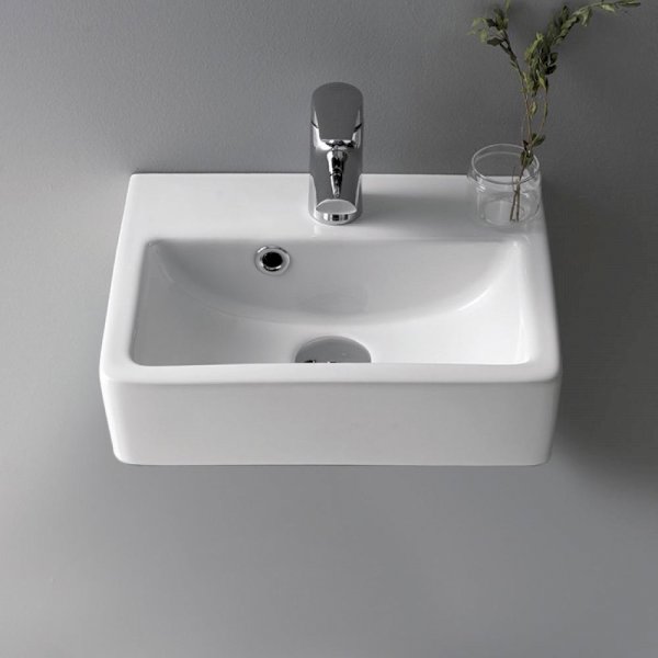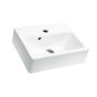 Rectangle white bathroom sink made from high quality ceramic. Contemporary style sink with wall mounted mounting. Sink has 1 pre-drilled faucet hole. Part of the CeraStyle Rita collection. Made in Turkey.