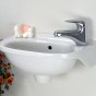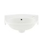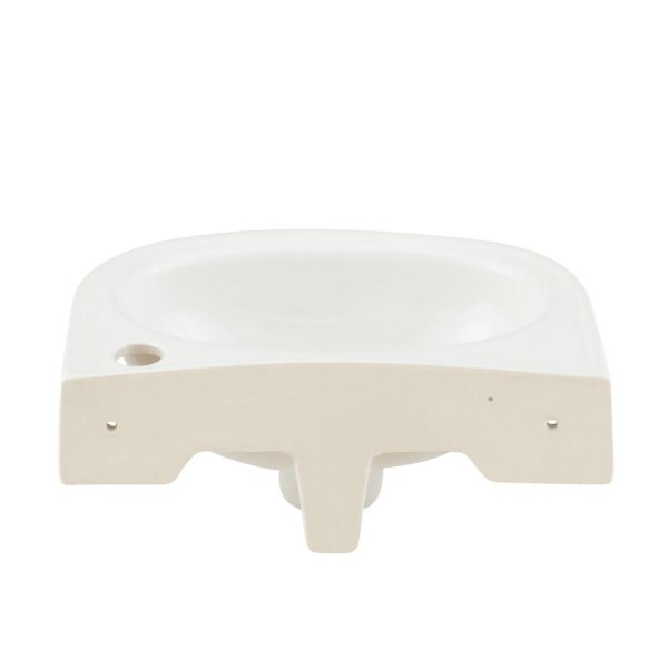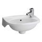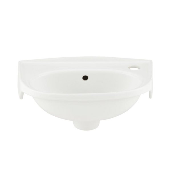 Meet your decorating needs with a stylishly designed diminutive white basin. In keeping with the small scale, the ledge is narrow with a faucet hole punched on the right side. Vitreous China construction ensures beauty as well as easy care.