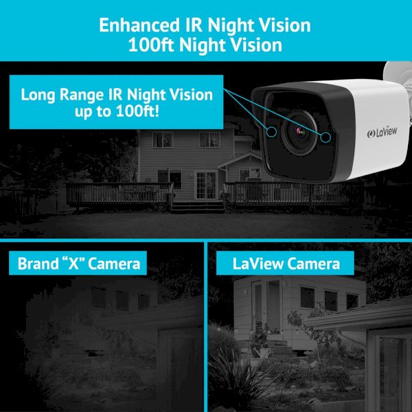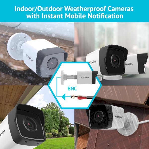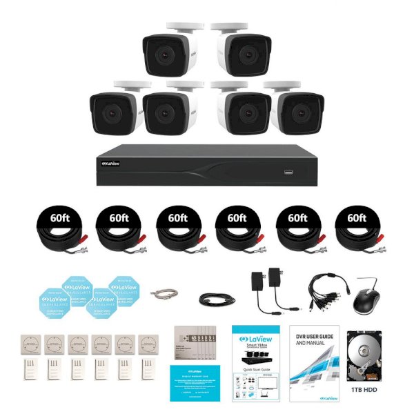 Security camera systems for home or business are crucial to keeping your loved ones and property safe and secure. This premium ultra HD 4K system provides comprehensive coverage with the industry’s top-of-the-line surveillance technology. It’s the perfect security camera system to implement for the first time or to seamlessly upgrade older kits. Leave it to LaView to provide you with expert surveillance solutions and peace of mind, 24/7. Camera Specifications: Lens: 2.8 mm Image Sensor: 8.29M progressive scan CMOS Resolution: 8MP (3840x2160) IR Range: Up to 100 ft. Shutter Time: 1/12.5 s to 1/50,000 s Frame Rate: 15fps Digital Wide Dynamic Range: 105 dB Video Compression: H.265+ Operating Temperature: -22°F - 140°F Weatherproof Rating: IP67 Power Consumption: Maximum. 5.3-Watt Dimensions: 58 mm x 61 mm x 159.8 mm Weight: 0.76 lbs. What’s in the Box:6 x 4K (8MP) Bullet TV I Cameras 1 x 8-Channel 4K DVR1 x 1TB Hard Drive (installed) 6 x 60 ft. BNC Cables1 x HDMI Cable1 x DVR Power Cable1 x 1 to 8 Splitter2 x AC Power Adapters1 x USB Mouse1 x Quick Start Guide1 x Camera User Guide1 x DVR User Guide6 x Deterrent Stickers.