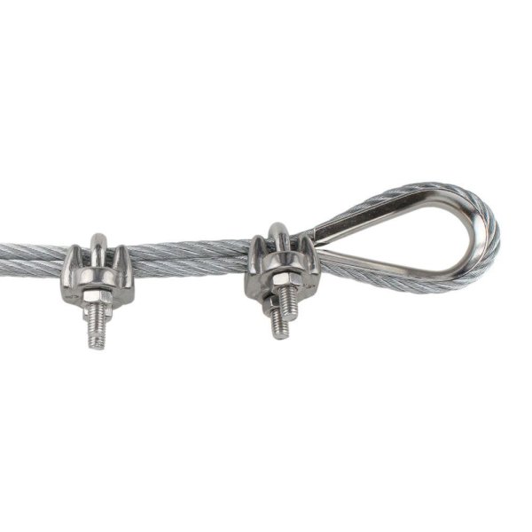 Wire rope clamp sets serve as an alternative to splicing and are used to secure wire rope around a thimble. For use on uncoated wire rope. Do not use on coated wire rope without first removing the coating from the assembly area.