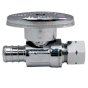 The ApolloPEX 1/2 in. Chrome-Plated Brass PEX Barb x 3/8 in. Compression Quarter-Turn Straight Stop Valve is simple to install and provides flow control through a quarter-turn ball valve. Most commonly used at point of use fixtures, it allows for repair and maintenance of fixtures without the need to shut down flow control to the entire system. The 3/8 in. compression outlet provides the capability to install 3/8 in. O.D. tubing or 3/8 in. supply lines. It is designed for use on point of use fixtures such as dishwashers, toilets and faucets. ApolloPEX barb fittings are a key component of the most economical potable water piping systems. Also capable of integration into hydronic heating systems, ApolloPEX valves can be secured into place using copper crimps, stainless steel pinch clamps or stainless steel crimp sleeves (all sold separately). The ApolloPEX system is a comprehensive piping system comprised of brass fittings, poly alloy fittings, manifolds, valves, fasteners, tools and tubing designed for implementation in water delivery systems, simple or complex.