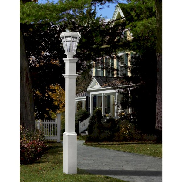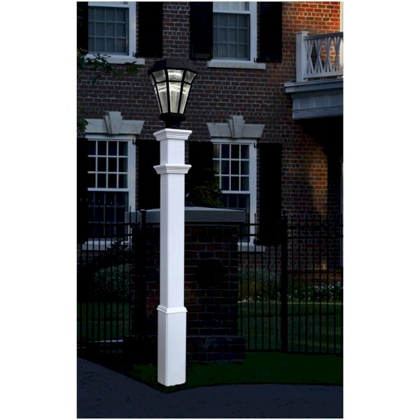 This New England Arbors 5 in. x 71 in. Sturbridge Lamp Post (lamp fixture purchased separately) is made of weather-resistant vinyl to withstand the elements. The post includes a universal 3 in. collar mounting cap to allow you to install any standard lamp. Weather-resistant to prevent damage from the elements; UV protected to inhibit discoloration.