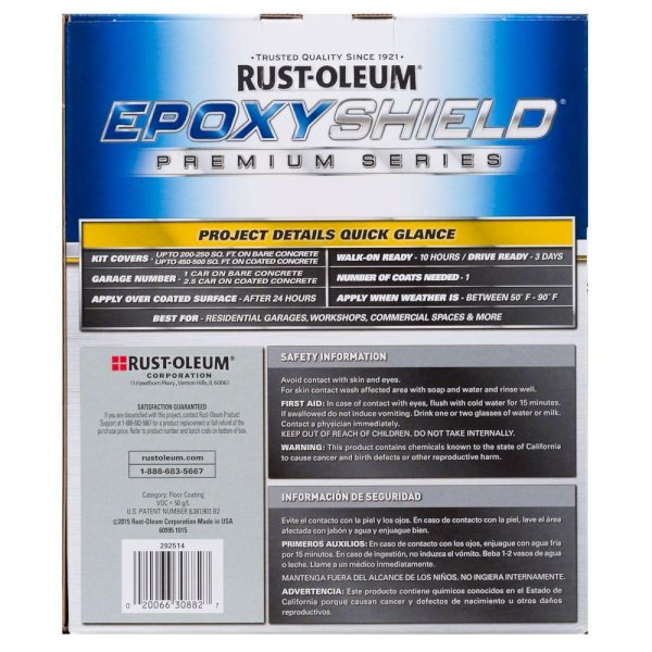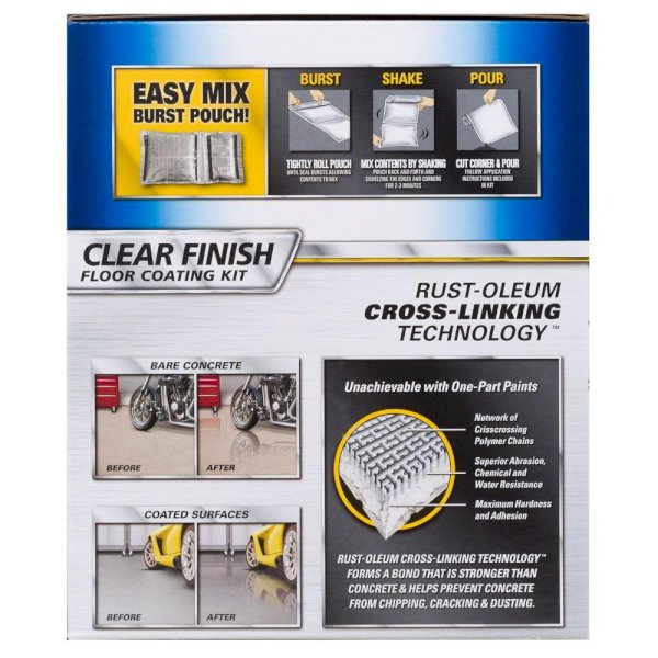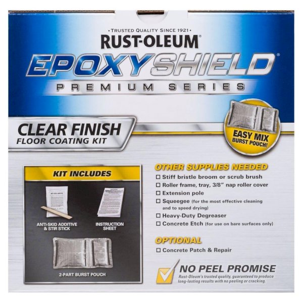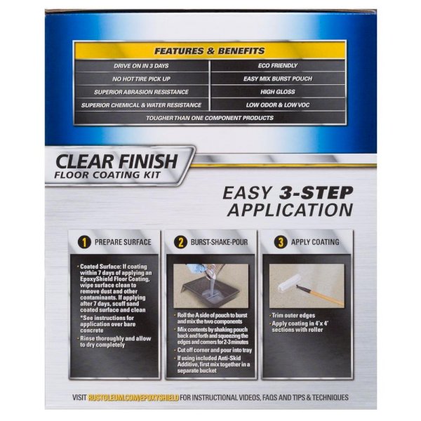 Rust-Oleum EpoxyShield 90 oz. Clear High-Gloss Low VOC Premium Garage Floor Kit (2 Pack) adds a high-gloss, protective finish to coated and bare concrete surfaces. Specially formulated, two component, epoxy floor coating provides resistance to wear, impacts, abrasion, chemicals, stains and heavy foot and vehicle traffic to help ensure that the coating retains its showroom-quality finish over time. Strongly adheres to concrete surfaces to provide excellent durability.