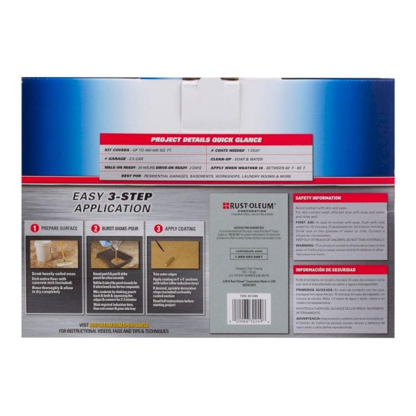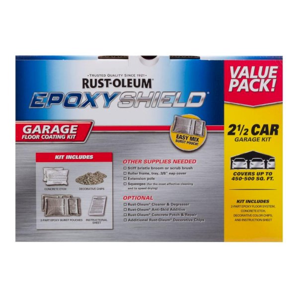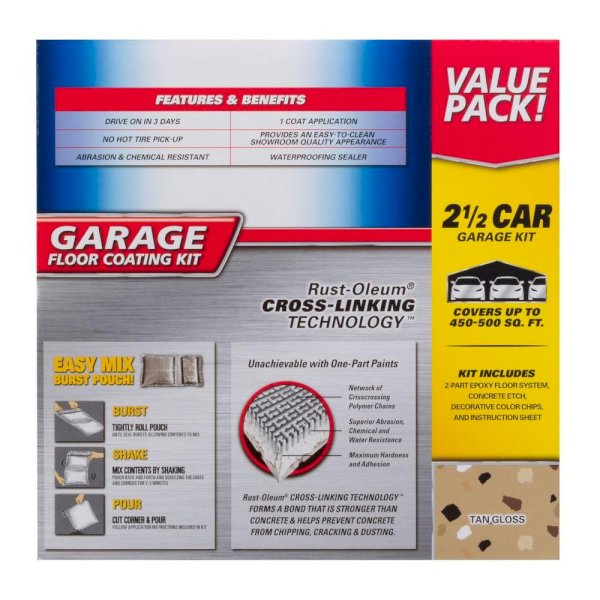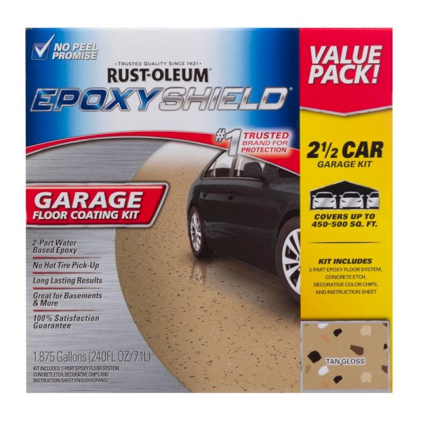 Rust-Oleum EpoxyShield 240 oz. Tan High-Gloss Low VOC 2.5 Car Garage Floor Kit beautifies and protects your garage floor or workshop area. Specially formulated, 2 components, water-based epoxy floor coating provides superior adhesion and durability. Designed for one coat coverage, easy to apply and provides professional-looking results.