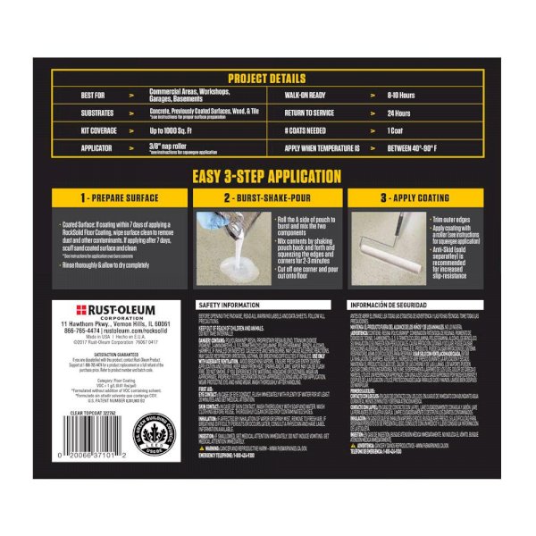 Rust-Oleum RockSolid 360 oz. Clear Polycuramine Professional Top Coat offers unsurpassed durability. Unique Polycuramine clear high gloss formula is 20 times stronger than epoxy. Resists salt, oil, gas and other harsh chemicals, this is 1 of the toughest floor coatings available. Works great on workshop floors, garage floors and other interior concrete surfaces. Use as a protective finish over coated or bare concrete surfaces. Zero VOC's and a low odor make it a great choice for indoor applications. Easy to maintain, lasts a lifetime while still looking fantastic.
