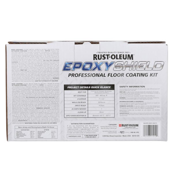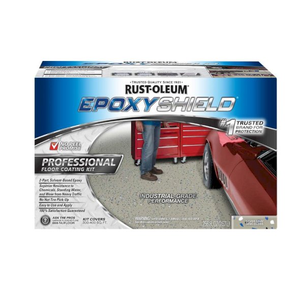Rust-Oleum EpoxyShield 2 gal. Silver Gray Semi-Gloss Professional Floor Coating Kit (Case of 2) strengthens and protects shop floors and other commercial concrete surfaces. Apply for excellent wear, impact and abrasion resistance to heavy foot and vehicle traffic. This kit contains 2-part solvent-based epoxy coating, decorative color chips and detailed instructions.