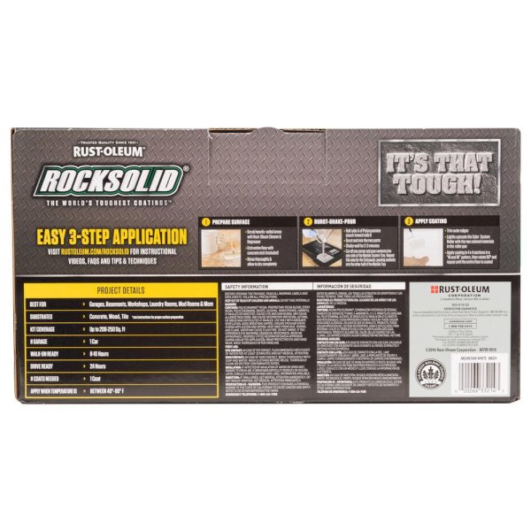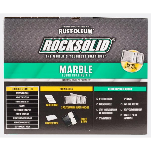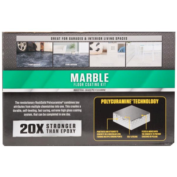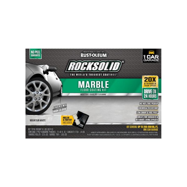 Rust-Oleum RockSolid Marble Mountain White Garage Floor Kit offers unsurpassed durability. Made with a unique Polycuramine formula that is 20 times stronger than epoxy. Resistant to salt, oil, gas and other harsh chemicals, this is one of the toughest floor coatings available. Product formula is perfectly suited for high traffic areas like garages and workshops but still safe enough to be used in other interior spaces like basements, laundry rooms and family rooms. Zero VOC's and a low odor make it a great choice for almost any indoor application. Easy to maintain, lasts a lifetime while still looking fantastic.