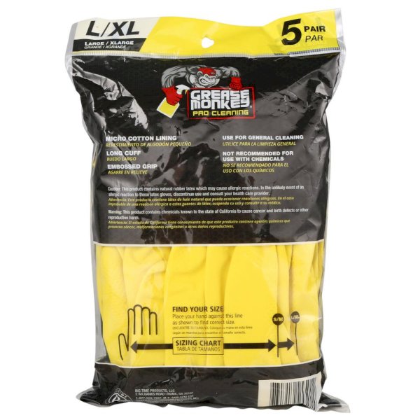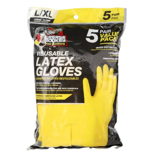 The Grease Monkey Pro Cleaning Latex Reusable Gloves (5-Pack) are 5 per pairs of reusable latex gloves. These gloves are water resistant and keep hands dry while cleaning. The multi-pack is a great value for all of your cleaning needs. The gloves are cotton flocked for comfort.