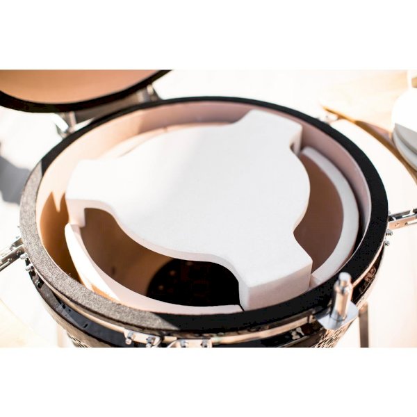Facilitates indirect cooking on your ceramic charcoal barbecue by providing a heat-directing barrier between the food and the flames. The unique design diverts heat to the outer edges of the grill promoting the ideal convection for low and slow cooking. It also distributes the heat for even cooking temperatures.