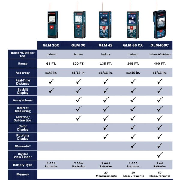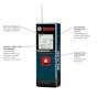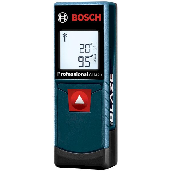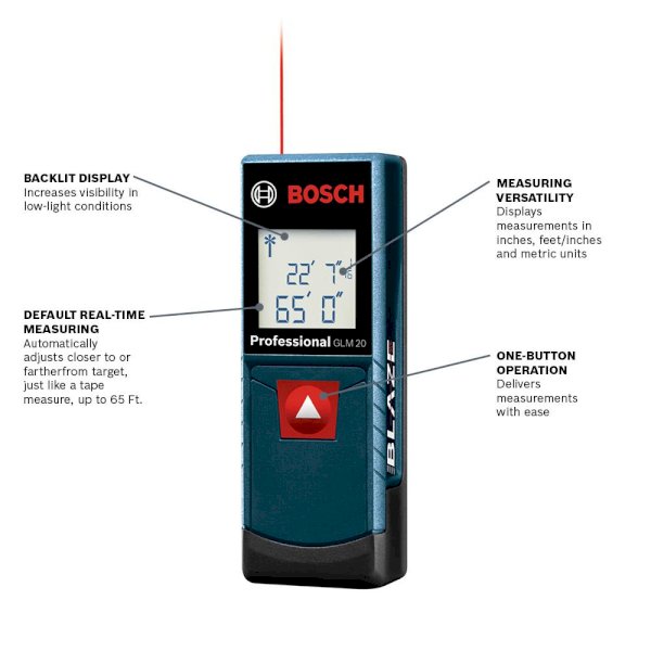 The Bosch BLAZE GLM 20 X Laser Measure is an easier, faster way to one-person measuring, instead of the old conventional tape measure. It is a recently introduced unit in the BLAZE lineup of laser measures which are designed to allow users to reach farther, work faster and stay accurate. With the click of a single button, the GLM 20 X delivers laser precision technology and real-time measurement mode, taking instant and reliable measurements up to 65 ft. This allows one person to size up the job in seconds. Square and compact by design, this laser measure is ready for anywhere portability. It has a backlit display for easy viewing, even in dark areas. The laser measure is simple to operate, so users need only press one button to get accurate measurements to within 1/8 in. and press again to hold the measurement.