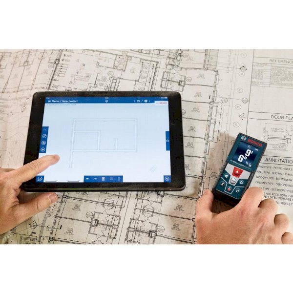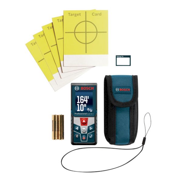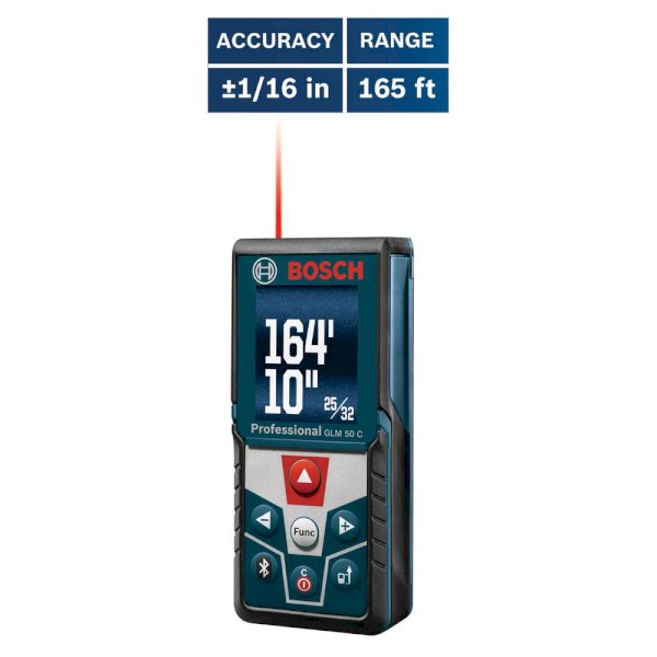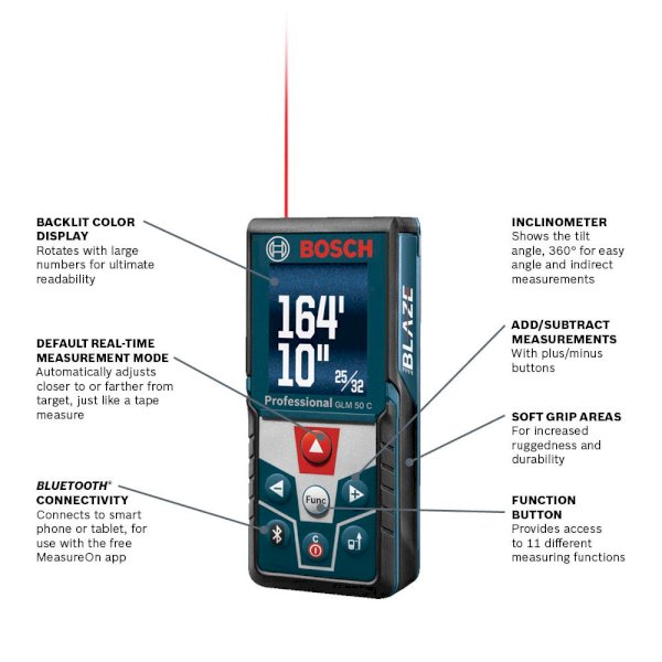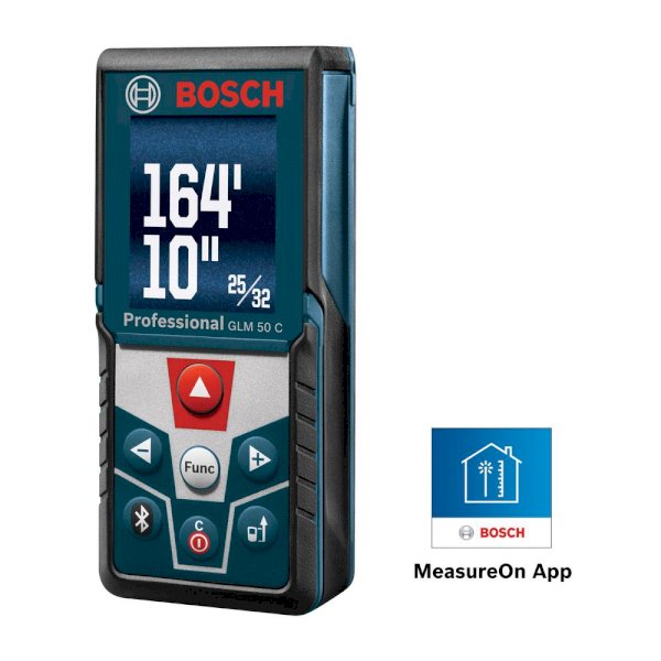 The Bosch GLM 50 CX offers a backlit color display with large numbers to easily see measurements, letters and words to provide simplicity when using its array of features. In addition to screen enhancements, the GLM 50 CX offers Bluetooth functionality, so users can digitally transfer measurements to a smartphone or tablet. Extreme accuracy of 1/16 in.; unit has great range at 165 ft. The GLM 50 CX offers multiple modes; 3 indirect measurement modes including multi-surface area. A built-in inclinometer allows the user to determine the angle of pitch and confirm when the tool is level. Includes stakeout measurement that pinpoints recurring marks along a line, e.g. every 6 in.