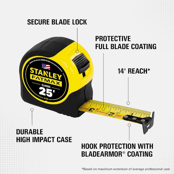 STANLEY FATMAX® tapes fit your toolbelt, your hand, and the job. 14 ft. of reach* and a durable high impact case make this tape dependable on any jobsite. Protective full tape blade coating and added BladeArmor® at the hook extends tape life against abrasion and heavy use**. Large, easy to read numbers and standard stud markers assure accuracy with the STANLEY FATMAX Classic tape measure.