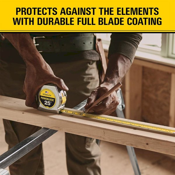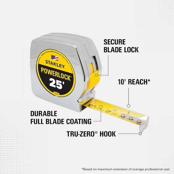 STANLEY POWERLOCK® tapes fit your toolbelt, your hand, and the job. 10 ft. of reach* and a durable case make this tape dependable on any jobsite. Tru-Zero® hook end provides accurate inside/outside measurements and the secure blade looks keeps tape blade from moving while measuring. Protective full tape blade coating extends tape life against abrasion and heavy use**.