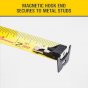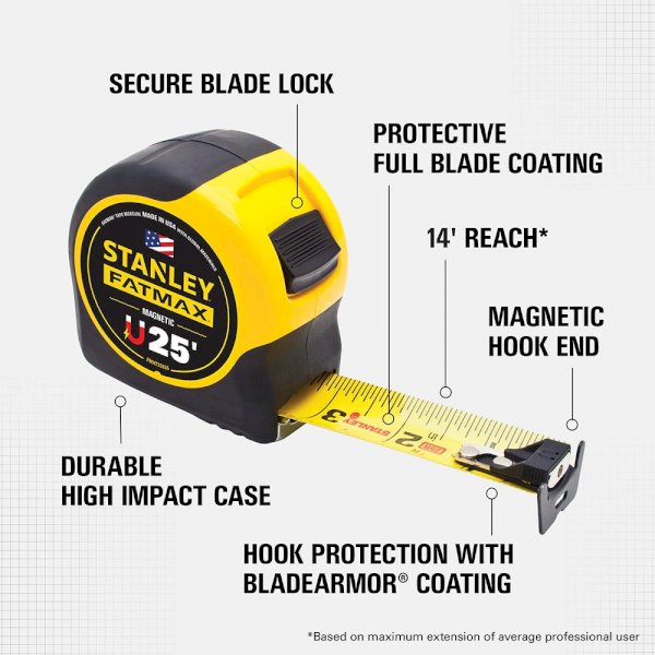 STANLEY FATMAX® Magnetic tapes provide an extra set of hands when working with metal surfaces. 14 ft. of reach* and a durable high impact case make this tape dependable on any jobsite. A strong rare earth magnet provides a secure hold to metal studs and metallic surfaces for the easiest single user measurements possible. Protective full tape blade coating and added BladeArmor® at the hook extends tape life against abrasion and heavy use**. Large, easy to read numbers and standard stud markers assure accuracy with the STANLEY FATMAX Magnetic tape measure.