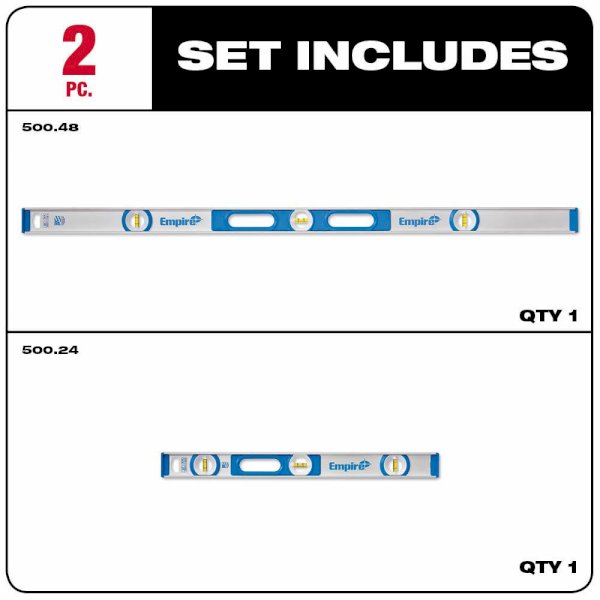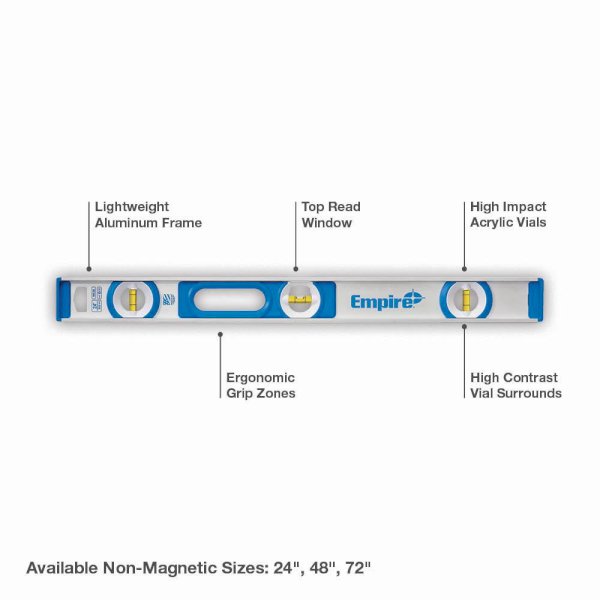 The Empire 48 in. and 24 in. I-Beam Levels are part of the 500 Series and offer superior performance in all key areas of users’ needs and functionalities. The Empire I-Beam levels have exclusive high contrast vial surrounds that make viewing easier in all light conditions and feature high impact acrylic e-Band vials for unmatched durability. Their patented blue-bands maximize bubble meniscus visibility and are accurate within 0.0005 inch per inch in all working positions. Empire’s I-Beam frame construction guarantees long-life accuracy and is equipped with impact-resistant end caps to withstand the harshest jobsite conditions. The Empire 500 Series features a top-read window for clear overhead viewing and has built-in molded grip zones for enhanced portability. The I-Beam levels are backed by a limited lifetime warranty.