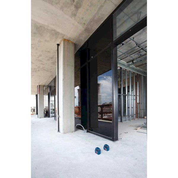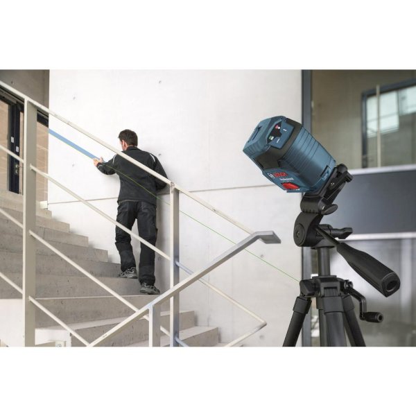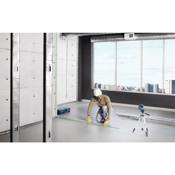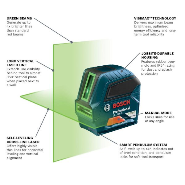 The Bosch GLL 100 GX Green-Beam Self-Leveling Cross-Line Laser features a laser with vertical, horizontal and cross-line modes. Green beams are up to 4X brighter than standard red beams, and this gives the tool a working range up to 100 Ft. The tool offers an accuracy of ±1/8 In. at 33 Ft. and ±3/8 In. at 100 Ft. The laser projects two lines independently or together, for a broad array of alignment and leveling applications. It includes Bosch-exclusive VisiMax technology, which allows for outstanding line visibility in standard working conditions. It constantly monitors the laser's temperature so the diodes are always driven to maximum line visibility, while protecting the laser diodes from overheating. The Bosch Smart Pendulum System self-levels and indicates out-of-level condition, to help ensure an accurate layout. It locks the pendulum after the laser is switched off for secure transport.