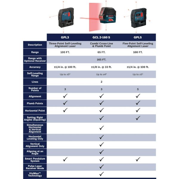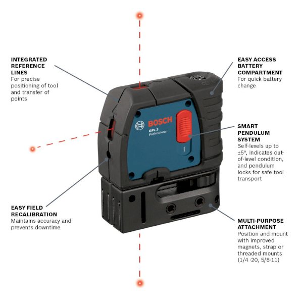 Plumb and Level Point Projection Accurately transfers and aligns level, plumb, 90 Degree and grade points. Patented Diamond-Cut Beam Splitter Single diode projects all points for superior accuracy. Smart Pendulum Leveling System - Self-levels senses and indicated out-of level condition, locks when switched off. Robust Over-Molded Housing - Water and Dust Proof to ensure years of dependable operation.