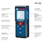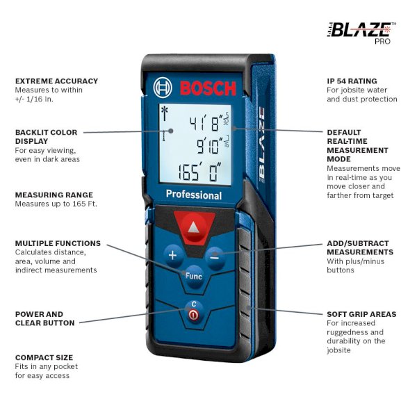 Measure with precision and speed with the Bosch BLAZE Pro GLM165-40 165 ft. Laser Measure. This fully featured tool provides default real-time distance, area, volume and indirect measuring functions. An easy-to-read backlit display lets you get readings day or night. Laser precision technology allows this pocket-sized tool to take instant and reliable measurements up to 165 ft., so you can size up the job in seconds. It is accurate up to 1/16 in.