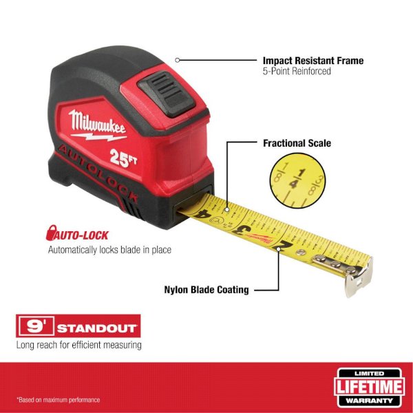 Milwaukee Tape Measures are Nothing But Heavy-Duty. Featuring Nylon Bond Blade Protection and a 5-Point Reinforced Frame, they offer the Longest Life by resisting contamination wear and increasing protection when dropped. To increase productivity on the jobsite, Milwaukee Tape Measures feature fractional scale for easy reading and optimized hook designed for scoring. For added utility, Milwaukee Tape Measures have stamped steel belt clips and are lanyard ready.