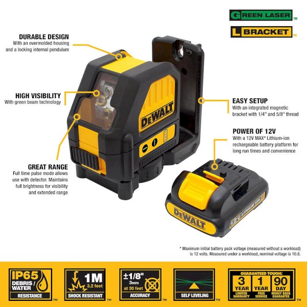 The DW088LG 12-Volt Green Cross Line Laser features 12-Volt Lithium-Ion rechargeable power tool battery platform, self leveling cross lines, and green beam laser technology. Over-molded housing and IP65 are water and debris resistant.