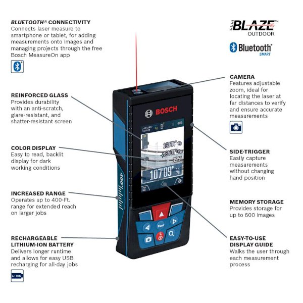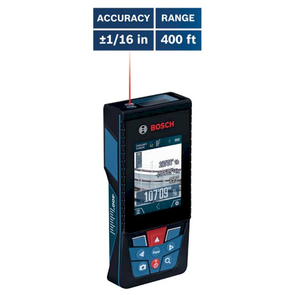 The Bosch BLAZE Outdoor GLM 400 C Connected Laser Measure with Digital Viewfinder features an adjustable zoom to find the laser spot in sunlit conditions. The digital laser Measure also offers Bluetooth functionality, so users can digitally transfer measurements to a smartphone or tablet. It is an easy-to-use tool, with integrated guides that walk the user through each measurement process. Accurately measures distances up to 400 ft.