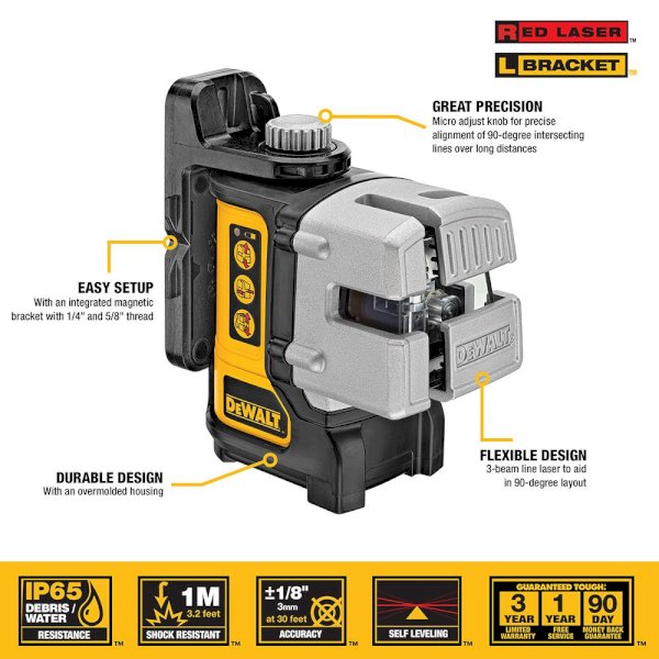 Get better productivity on the job with the DEWALT DW089k Line Laser. It has multiple design enhancements and is great for professionals working on residential and commercial applications such as installing cabinets, drop ceilings, chair rails or doors and windows. The DW089K stands apart from other line lasers on the market because it has a second plumb line that forms a 90° intersecting line on the floor and ceiling. You won't need to use a second laser because this third vertical beam can handle layout applications, saving time and maximizing productivity. With a track clearance of over 1-3/4 in., the DW089K can be used on commercial wall layout applications without the need for extra accessories to raise the laser over drywall track. The micro adjust knob provides easy alignment, while the metal roll cage makes it durable. There is an integrated pivot bracket and universal wall mount that works perfectly on acoustical ceiling installation. Steadily adjust the 90° layout lines in small increments without nudging the laser to hit a specific mark with the micro adjust knob. The beam is two times brighter than that of the prior DEWALT model, giving better visibility.