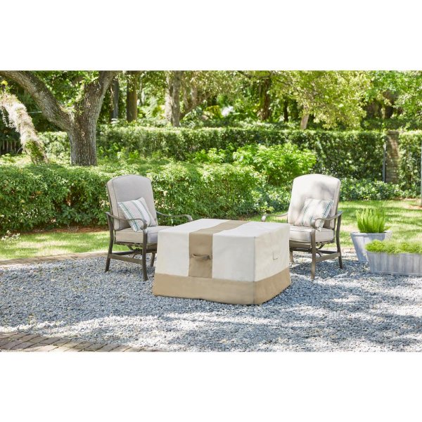 This Hampton Bay Patio Large Square Gas Fire Pit Cover features a weather-resistant design that protects outdoor furniture from dust, dirt, sun, rain and heavy snow for year-round use. The heavy duty Rip-Stop fabric is durable and resists ripping and tearing to protect your patio furniture for years to come. With elastic and adjustable buckles on the bottom straps, these quickly secure to the furniture legs, so your cover stays on during the windiest of days. Handles on the cover offer easy fitting and removal. This cover fits up to 40 in. L x 40 in. W x 25 in. H.