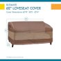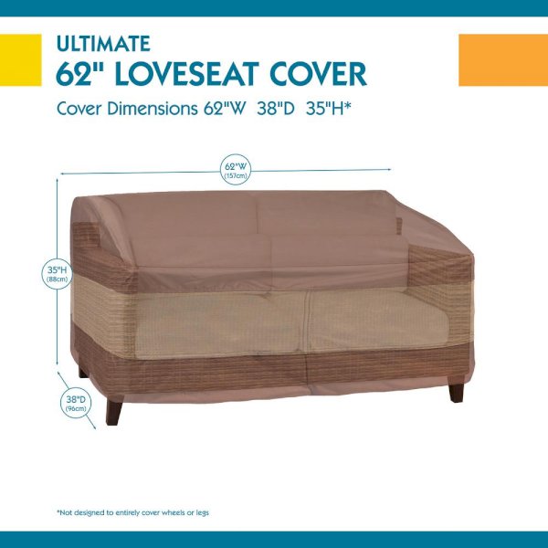 Fits Loveseats up to 60 in. wide. These covers are the "Ultimate" because they are ideal for use in harsh weather and strong wind conditions. Duck Covers Ultimate Series patio furniture covers are designed to protect patio furniture from dust, dirt, sun, rain and heavy snow. Manufactured using a combination of high-strength polyester top panel, plus innovative, multi-layer, breathable side panels to help eliminate condensation. The multi-layer, breathable side panels eliminates the need for vents and provides additional cover height, unlike shorter competitive covers which offer less protection. High-strength polyester base for added durability. Mocha Cappuccino color. 2-year limited warranty has you covered. Migrate to the best patio furniture covers today.