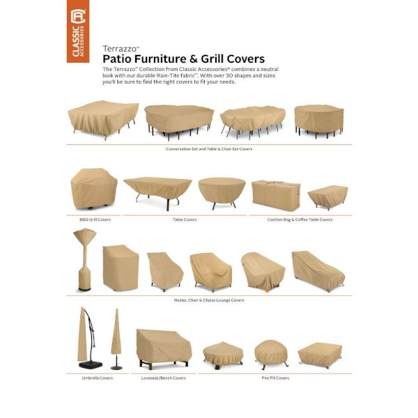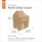 The tough, stylish fabric of the Terrazzo patio furniture cover collection protects against rain, snow, sun and dirt and won't crack in cold weather. An elastic cord in the bottom hem provides a fast and custom fit. This cover fits a stack of 6 patio chairs up to 33.5 in. L x 25.5 in. W x 45 in. H.