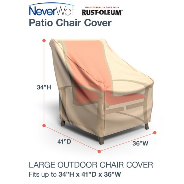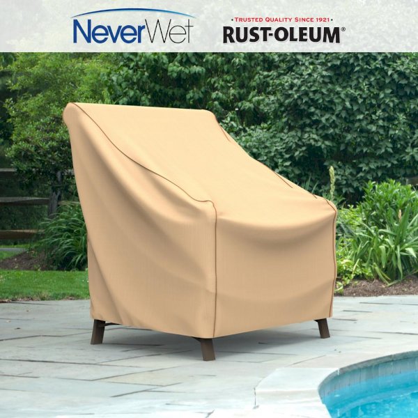 Our groundbreaking Rust-Oleum and reg; NeverWet and reg; patio furniture covers offer the unparalleled, waterproof protection your patio furniture deserves. Featuring super-hydrophobic NeverWet and reg; technology, water will roll right off this cover, taking mud, tree-dirt and bird droppings with it. This cover is made from a lightweight, high-tech 300 denier Polyester that is treated with NeverWet a miracle of modern science that repels water, mud, ice and other liquids. This waterproof material is easy to handle, stain resistant and self-cleans in the rain or with a garden hose. This cover is also fully breathable, so you won't have to worry about mold or mildew from growing underneath the cover and spreading to your furniture. This cover comes with 4 sewn-in straps that can be tied to the chair legs to keep the cover securely in place. Vents on the side of the cover keep air flow circulating without letting rain into the cover. Our Rust-Oleum and reg; NeverWet and reg; covers are unlike any other patio furniture covers on the market. Blending style with functionality, these waterproof covers will help extend the life of your outdoor patio furniture. This cover comes with a 2-year manufacturer's warranty.