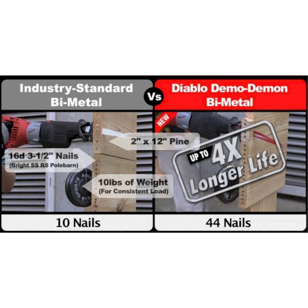 This Wood and Metal Cutting Reciprocating Saw Blade is designed for maximum performance in nail embedded wood/metal cutting and demolition. Included in this set is the Demo Demon and Steel Demon blades which provide faster cuts and less vibration. The double-tooth configuration provides faster material removal and extra durability.