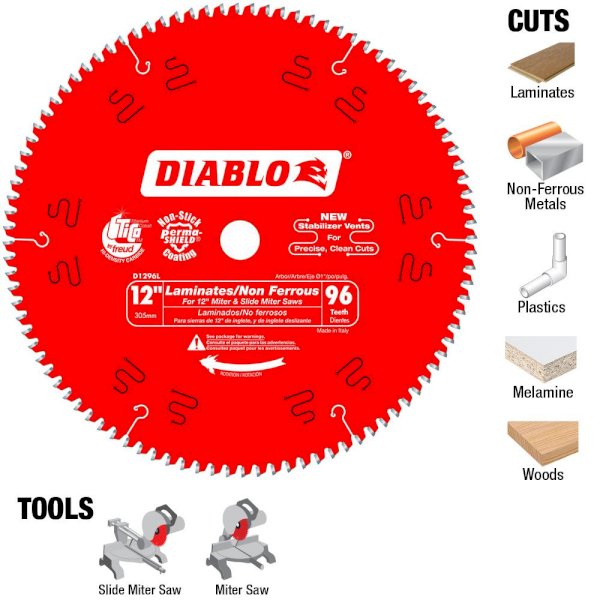 Diablo's next generation 12 in. x 96 Tooth Non-Ferrous Carbide Circular Saw Blade features new laser-cut stabilizer vents for precise and clean cuts in laminates and non-ferrous materials. The advanced stabilizer vents feature a permanent filler baked in from top to bottom for absorbing noise and preventing sideways movement, allowing the blade to slice through laminates and non-ferrous metals cleanly, quickly and accurately. Constructed with TiCo Hi-Density special-blend carbide, Diablo's 12 in. non-ferrous blade produces precise cuts and provides 5X longer cutting life. The laser cut heat expansion slots allow the blade to expand and contract during use, keeping the cut true and straight. This blade is excellent for cutting laminate flooring, plastics, brass, aluminum, copper and fiberglass.
