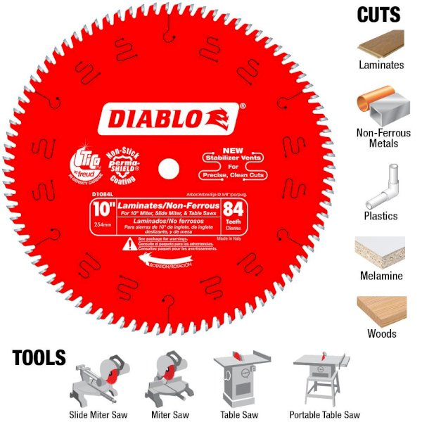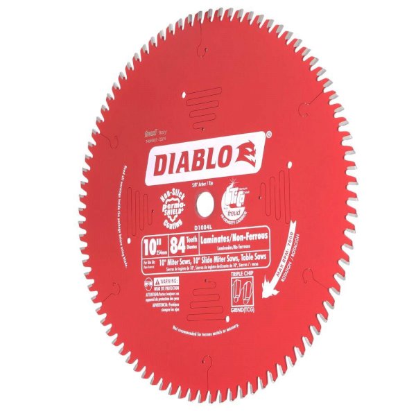 Diablo's next generation 10 in. x 84 Tooth Non-Ferrous Carbide Circular Saw Blade features new laser-cut stabilizer vents for precise and clean cuts in laminates and non-ferrous materials. The advanced stabilizer vents feature a permanent filler baked in from top to bottom for absorbing noise and preventing sideways movement, allowing the blade to slice through laminates and non-ferrous metals cleanly, quickly and accurately. Constructed with TiCo Hi-Density special-blend carbide, Diablo's 10 in. non-ferrous blade produces precise cuts and provides 5X longer cutting life. The laser cut heat expansion slots allow the blade to expand and contract during use, keeping the cut true and straight. This blade is excellent for cutting laminate flooring, plastics, brass, aluminum, copper and fiberglass.