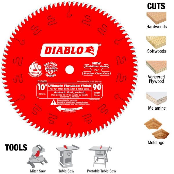 Diablo’s new Ultimate Polished Finish saw blades feature Axial Shear Face Grind (ASFG) that cleanly shears through materials for superior quality finishes on fine molding, hardwoods, softwoods, veneered plywood, melamine and more. Also featuring Double-Side Grind tooth geometry, an incredible 200 additional grinds, this blade produces precise, polished-like cuts equal to that of 220-Grit sandpaper or higher. Diablo’s proprietary TiCo Hi-Density Carbide is designed specifically to deliver extreme durability and 5X longer life on materials requiring polished-like finishes. Unlike other blades on the market, Diablo’s Ultimate Polished Finish saw blades have a laser-cut, ultra-thin kerf blade design for fast, effortless cuts on corded or cordless saws making this the go-to blade when working at a permanent location or at a portable jobsite. Diablo’s new Ultimate Polished Finish saw blades are Redefining cutting by introducing radical technology to maximize performance and extend cutting life, saving the PRO both time and money when completing their projects.