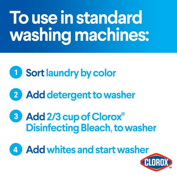 Clorox Disinfecting Bleach with CloroMax kills 99.9% of household germs and bacteria. America's #1 bleach brand cleans, disinfects, deodorizes, whitens and removes stains. Clorox Disinfecting Bleach whitens whites, keeps clothes whiter longer, and removes 70% more stains than detergent alone. Remove tough laundry stains from white clothes including red wine, grass, dirt and blood stains. It is safe to use in standard and HE washers. What's more, Clorox Disinfecting Bleach contains CloroMax Technology to protect household surfaces as it cleans, so stains won't stick and cleanup is easier. Clorox Disinfecting Bleach disinfects and deodorizes surfaces, killing 99.9% of mold and germs, including norovirus, flu virus, MRSA, E. Coli, and Salmonella left on household surfaces such as countertops, floors, toilets and more. Discover the power of clean with Clorox Disinfecting Bleach.