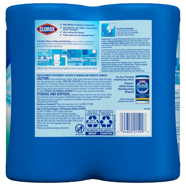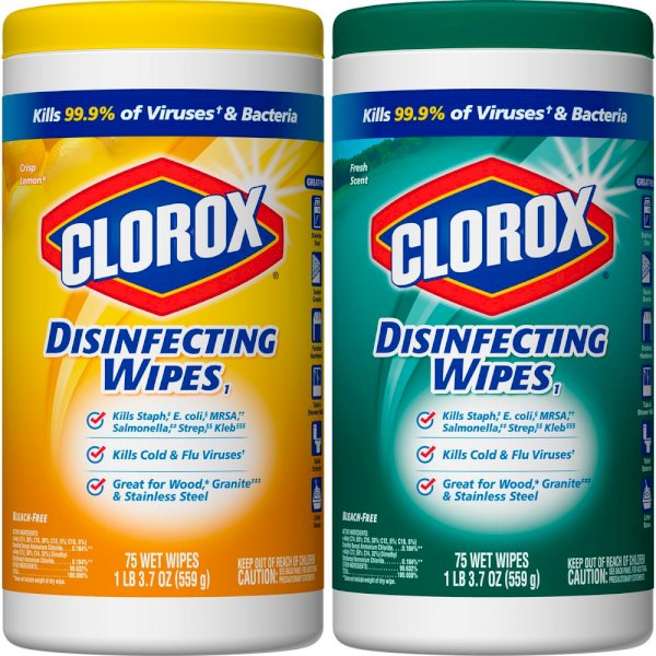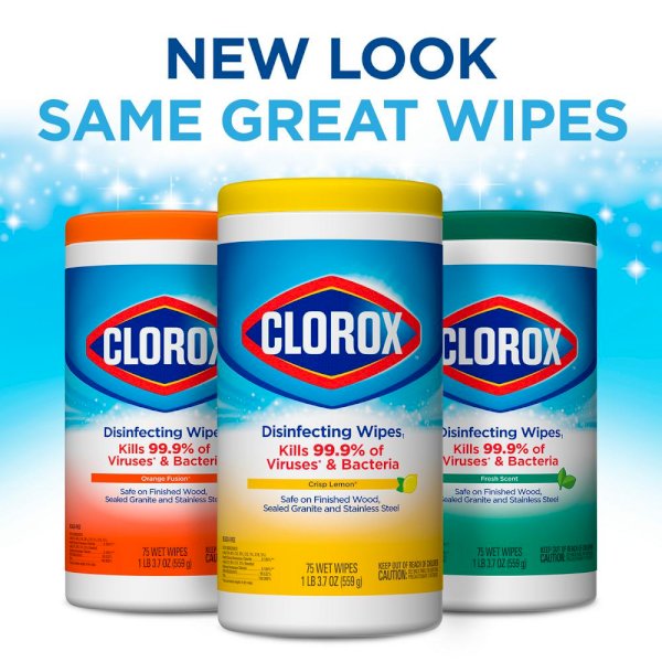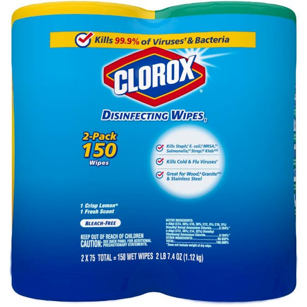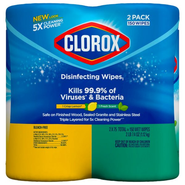 Clorox Disinfecting Wipes are triple-layered to clean, disinfect, deodorize and remove allergens for 5x Cleaning Power and leave a pleasant scent. Disinfecting Wipes clean and disinfect with antibacterial power that kills 99.9% of viruses and bacteria that can live on surfaces up to 48 hours, including staph, E. coli, MRSA, salmonella, strep and Kleb. These all-purpose disposable wipes remove common allergens, germs and messes on surfaces like kitchen counters, bathroom surfaces and more. Wipes are safe to use on finished wood, sealed granite and stainless steel. Disinfecting Wipes are also great on non-food-contact surfaces in the home, office, classroom, pet area, dorm and locker room. Clean with bleach-free wipes to keep dirt and germs away.