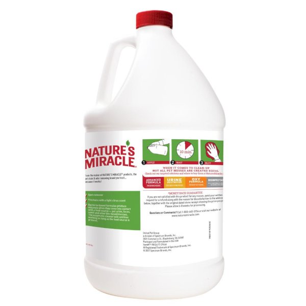 Natures Miracle pet stain and Odor Removers have been a trusted brand for pet mess cleanup for more than 30 years. Natures Miracle brand can be trusted to provide innovative solutions to a range of pet problems. Nature's Miracle Stain and Odor Remover has a bacteria-based formula that produces enzymes when it comes in contact with a food source - pet urine, feces, vomit, and other bio-based messes. The enzymatic cleaner will continue working as long as the food source is present. This product is tough on dog urine, feces, vomit, drool and other organic stains and odors your pet may leave behind. This stain and odor remover also freshens with a light citrus scent. It can be used on carpets, hard floors, furniture and more. It is safe for pets and home when used as directed. Before using, test surfaces to be treated for color fastness by applying to a hidden area.
