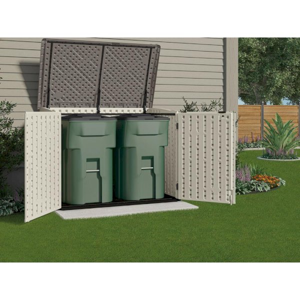 Hide unsightly garbage cans and organize your storage space with the Suncast horizontal shed. This shed is spacious enough to hold 2 96 Gal. garbage cans, but is designed with a low profile to sit below a fence line or look great on the side of your house. Durability, security and easy assembly are just a few more reasons why the Suncast horizontal shed is the shed for you.