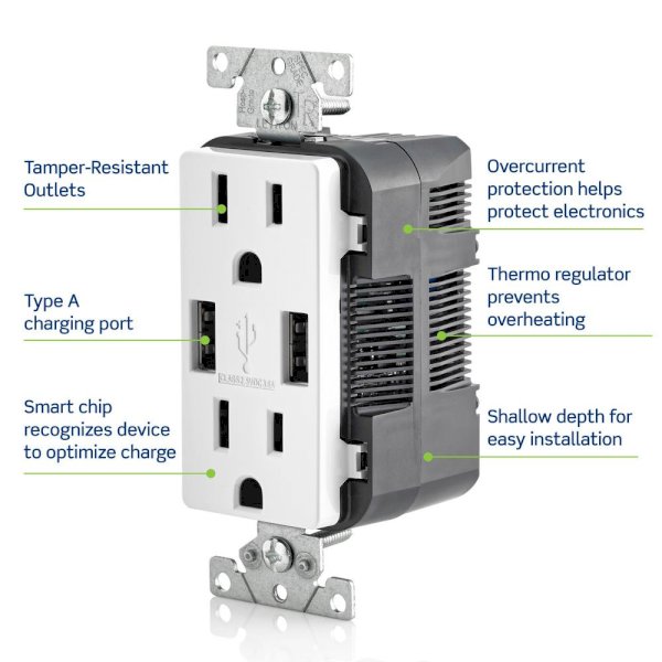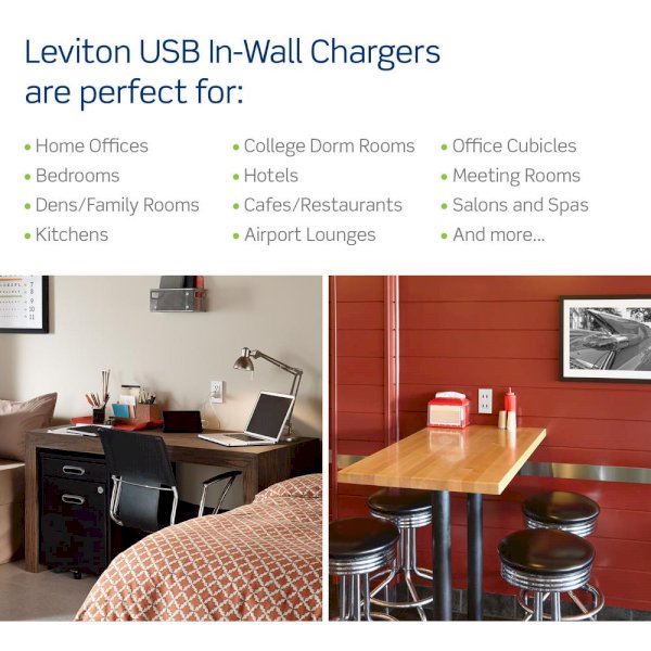Our USB Charger Devices feature a smart chip that recognizes and optimizes the charging power of your electronic devices for fast and efficient charging. Strategically placed vertical USB ports in all models provide generous room to insert and maneuver charging cords and add to the contemporary and aesthetically appealing design. Plus, adapter-free charging eliminates unsightly clutter contributing to a neat appearance on countertops, desktops or wherever you choose to charge. Engineered for compatibility with the latest technology, Leviton USB Charger Devices are designed to charge tablets, smart and mobile phones, gaming devices, e-readers, digital cameras and a host of other electronic devices.