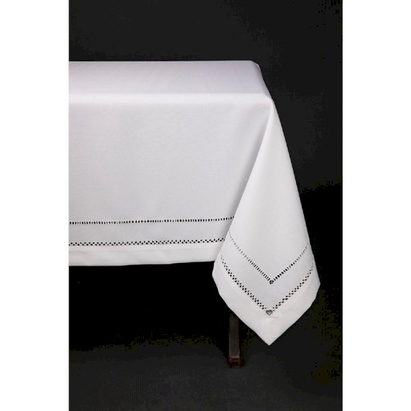65 in. x 140 in. White Double Hemstitch Easy Care Tablecloth