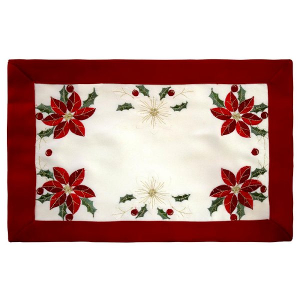 Holiday Embroidered Poinsettia 13 in. x 19 in. Cloth Place Mats with Red Trim Border (4-Set)