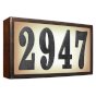 Serrano (Standard) lighted address plaque features a galvanized steel frame with a tough bronze color powder coat finish. Plaque can be seen up to 100 ft. away at night and comes with 4 in. black polymer numbers 0-9 twice and tube of adhesive glue in the box. Low voltage, plaque runs between 15-Volt - 18-Volts and can plug into your existing doorbell transformer. A set of bulbs are included with 10 ft. of low voltage wiring. A low voltage hardwire or plug-in transformer are also available and sold separately.