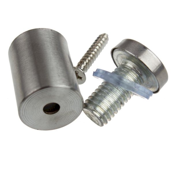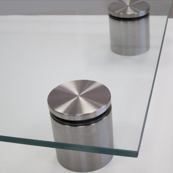 Stainless steel standoffs and cap assembly to protrude glass, mirrors, signs or any other object out from a wall or table. GlideRite Hardware standoffs are made of stainless steel with a brushed stainless steel finish. Price includes a single standoff, cap, nylon washers, mounting screw and drywall anchor. Cap bolt is 3/8 in. in diameter and the mounting hole is 3/16 in. in diameter. Standoffs from GlideRite Hardware are available in diameters of 1/2 in. to 1-1/2 in. and in various lengths. Diameter: 3/4 in. Cap Height: 1/8 in. Base Length: 1 in. Panel Thickness: 1/2 in. Finish: Brushed Stainless Steel Material: #202 Stainless Steel.