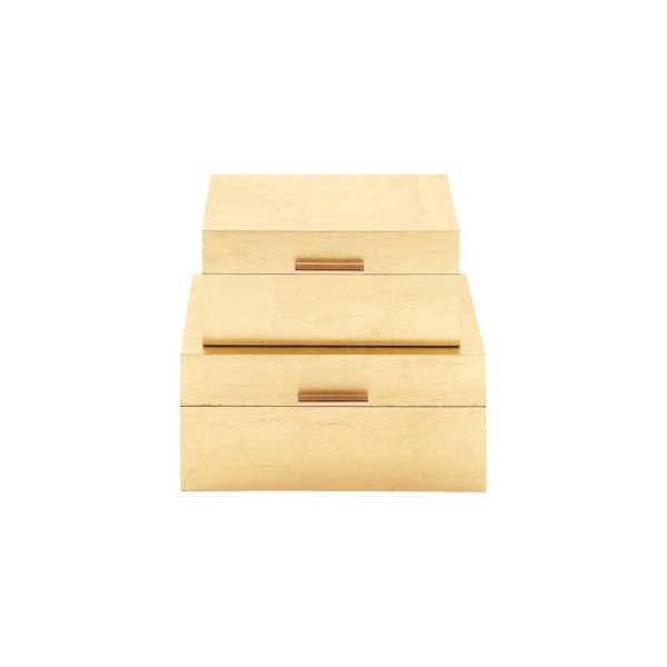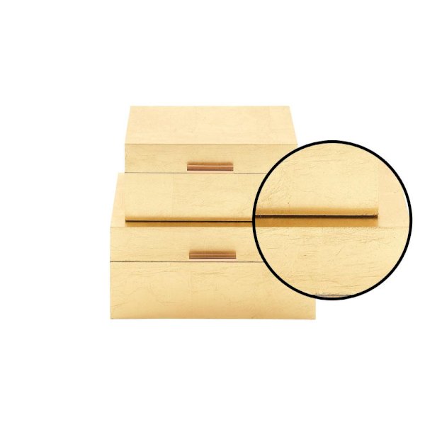 Bring on all the bright with this mega-glam pair of metallic gold decorative boxes. The textural finish surrounding each box has a very reflective gold leaf look. Each box is lined with a solid black interior and has a matching gold tab for easy open/close and gold hardware for a fully gilded look. Stack these as a set by some other sparkling decor or separate as home storage boxes in your living room to hide away remotes or bedroom for your jewelry.