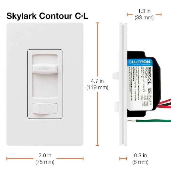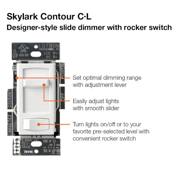 The Contour C.L dimmer provides optimal dimming performance of LED bulbs. This dimmer works with up to 150-Watt of dimmable LED/CFL or 600-Watt of incandescent/halogen, allowing you to control multiple bulb types on the same circuit. It is designed to control a broad range of dimmable LED and CFL bulbs from a variety of brands including Philips, Cree, GE, EcoSmart and Lighting Science. The Contour dimmer features a smooth slide, captive knob to adjust your light to any activity. Use the rocker switch to turn your lights off or on returning the lights to your favorite level. Coordinating Claro wall plate sold separately.