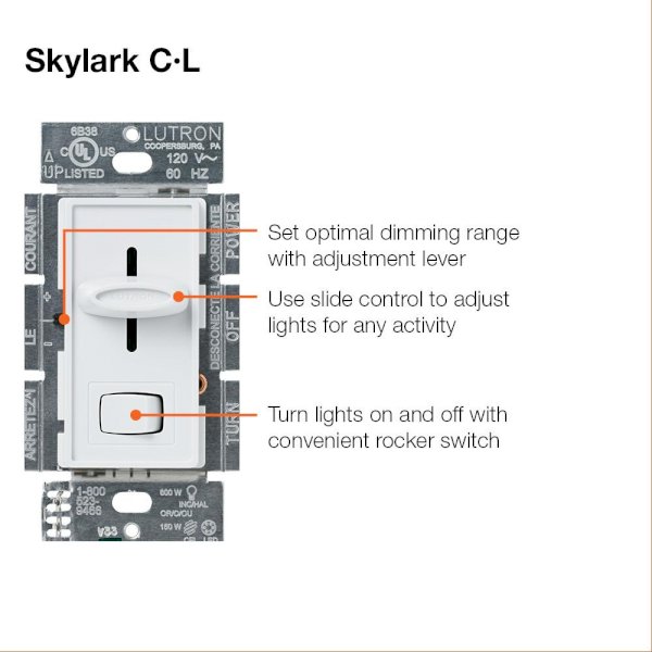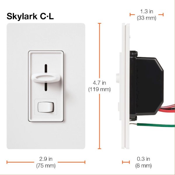 The Skylark C.L dimmer provides optimal dimming performance of LED bulbs. This dimmer works with up to 150-Watt of dimmable LED/CFL or 600-Watt of incandescent/halogen, allowing you to control multiple bulb types on the same circuit. It is designed to control a broad range of dimmable LED and CFL bulbs from a variety of brands including Philips, Cree, GE, EcoSmart and Lighting Science. The Skylark dimmer features slide knob to adjust your light to any activity. Use the rocker switch to turn your lights off or on returning the lights to your favorite level. Coordinating Claro wall plate sold separately.