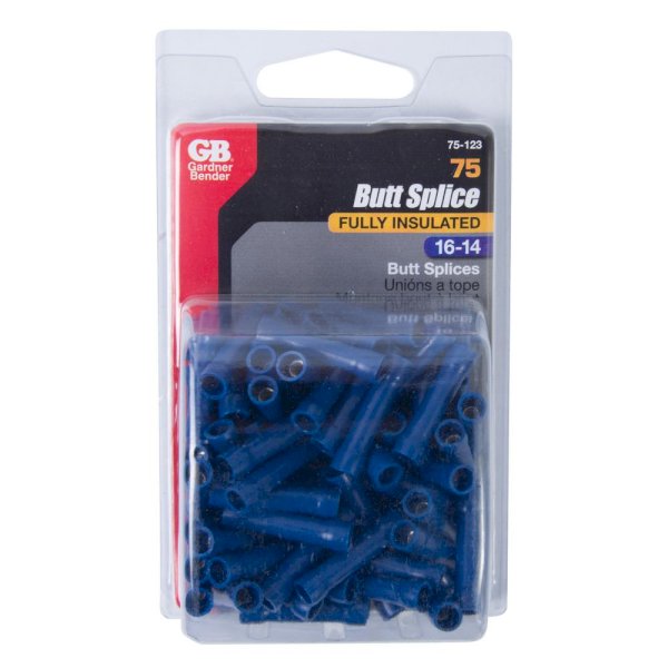 Dependable and easy to use, Gardner Bender terminals (and wiring accessories) offer the high quality and application flexibility that professionals demand. Available in a variety of packaging options, look to Gardner Bender for secure wire connection options. The Gardner Bender 16 - 14 AWG Blue Butt Splice Wire Connectors (75-Pack) connect and cover a pair of electrical wires. These vinyl connectors offer a temperature rating of 167°F. for resistance to heat. Insulated barrel ensures easier crimping.