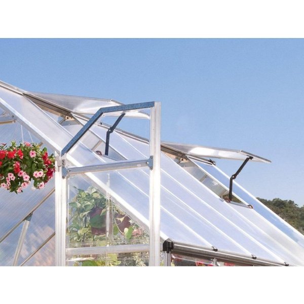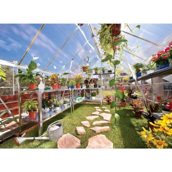 The Essence of spacious gardening. This greenhouse features high headroom and 96 sq. ft. for improved working space, two vent windows for temperature, humidity and airflow regulation and wide double doors with low threshold for comfortable and easy access. Additionally it includes a Galvanized Steel base, adding structural support, stability and alignment. Set up is easy and fast with the Sliding panels’ assembly system. Just slide and lock the virtually unbreakable, Twin-Wall Polycarbonate panels’ right into the greenhouse frame. Your plants will enjoy an insulated environment, protected from strong sunlight exposure and great conditions for nurture and growth.