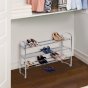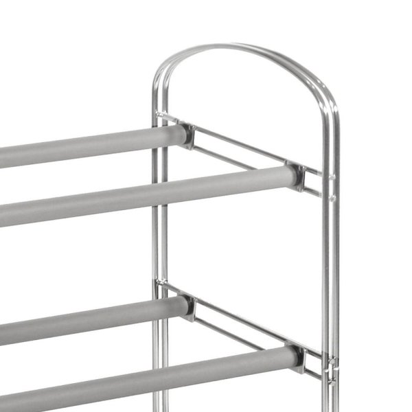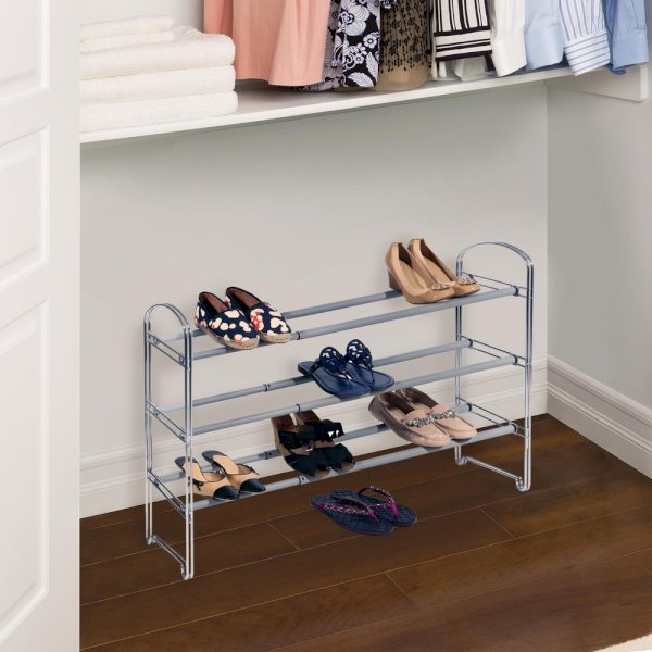 Stay organized with Seville Classics' 3-Tier Expandable Shoe Rack. Extendable poles allow the rack to grow (from 25.4 to 46.6 inches wide) along with your shoe collection. Unit holds as many as 21 pairs of shoes fully-extended. The steel crossbars are finished in a gray, non-slip, textured epoxy that keeps shoes from slipping off the rack. Frames are constructed from steel and plated in chrome.